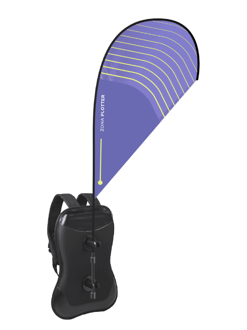 El pack de mochila con flybanner (tipo surf o gota) y mástil incorporado destaca como un reclamo visual, de comunicación y publicidad muy eficaz en muchos eventos al aire libre: conciertos, concentraciones deportivas, campañas de venta ambulante o para personalizar al staff o al guía en un tour turístico, por ejemplo.
